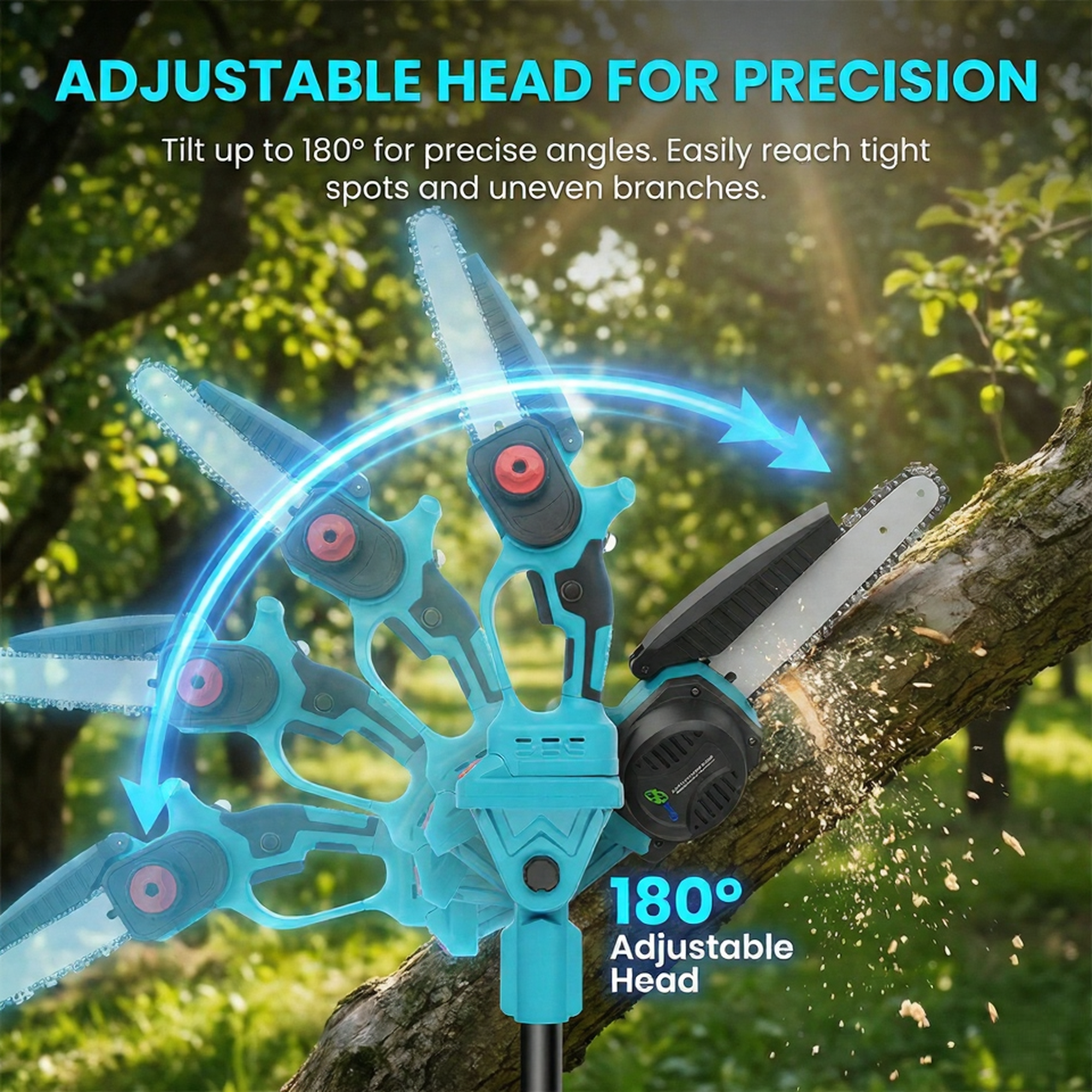 The cutting head can tilt up to 180°, allowing precise cutting angles in tight spots or awkward positions. This improves maneuverability on uneven or hard-to-reach branches.